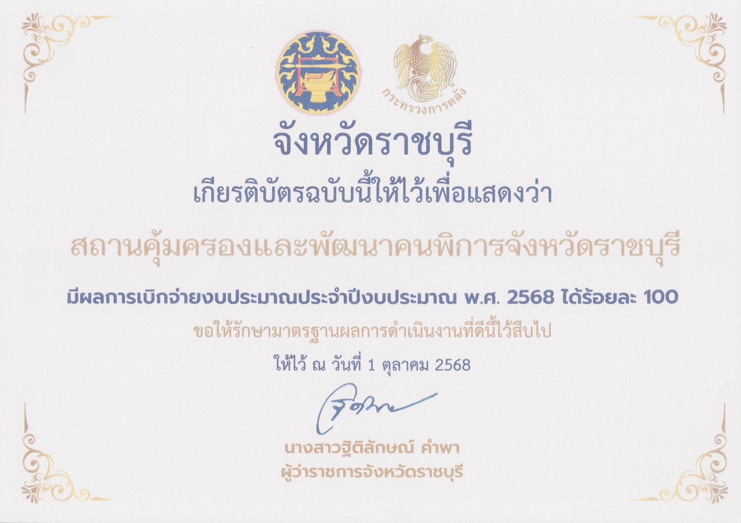 | วันที่ 15 ตุลาคม 2568 นางสาวสุทิศา ทับเหล็ก ผู้ปกครองสถานคุ้มครองฯ จ.ราชบุรี พร้อมด้วย บุคลากรของสถานคุ้มครองฯ จ.ราชบุรี เข้าร่วมรับใบประกาศเกียรติคุณหน่วยงานที่มีผลการเบิกจ่ายดีเด่นประจำปีงบประมาณ พ.ศ. 2568 เพื่อสร้างแรงจูงใจให้กับหน่วยเบิกจ่าย 149 แห่งในจังหวัดราชบุรีให้เบิกจ่ายเงินงบประมาณเป็นไปตามเป้าหมายที่คณะรัฐมนตรีกำหนดในการนี้ สถานคุ้มครองและพัฒนาคนพิการ จังหวัดราชบุรี มีผลการเบิกจ่ายงบประมาณประจำปีงบประมาณ พ.ศ. 2568 ได้ร้อยละ 100 โดยมี นางสาววริษฐา สงวนเสริมศรี รองผู้ว่าราชการจังหวัดราชบุรี เป็นประธาน ณ ห้องประชุมหลวงยกกระบัตร ชั้น 3 ศาลากลางจังหวัดราชบุรี |